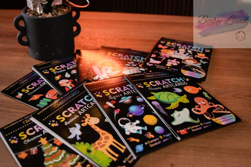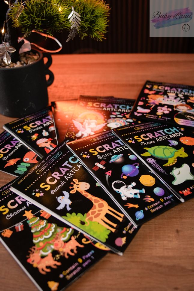 Всяка книжка съдържа десетки страници, качествена скреч повърхност и дървена писалка.