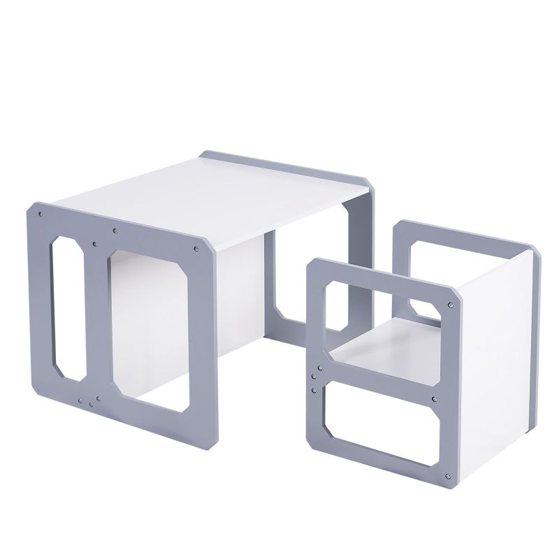 Монтесори Детска маса и Столче GINGER HOME, Дървен Комплект 3 в 1, бяло и сиво